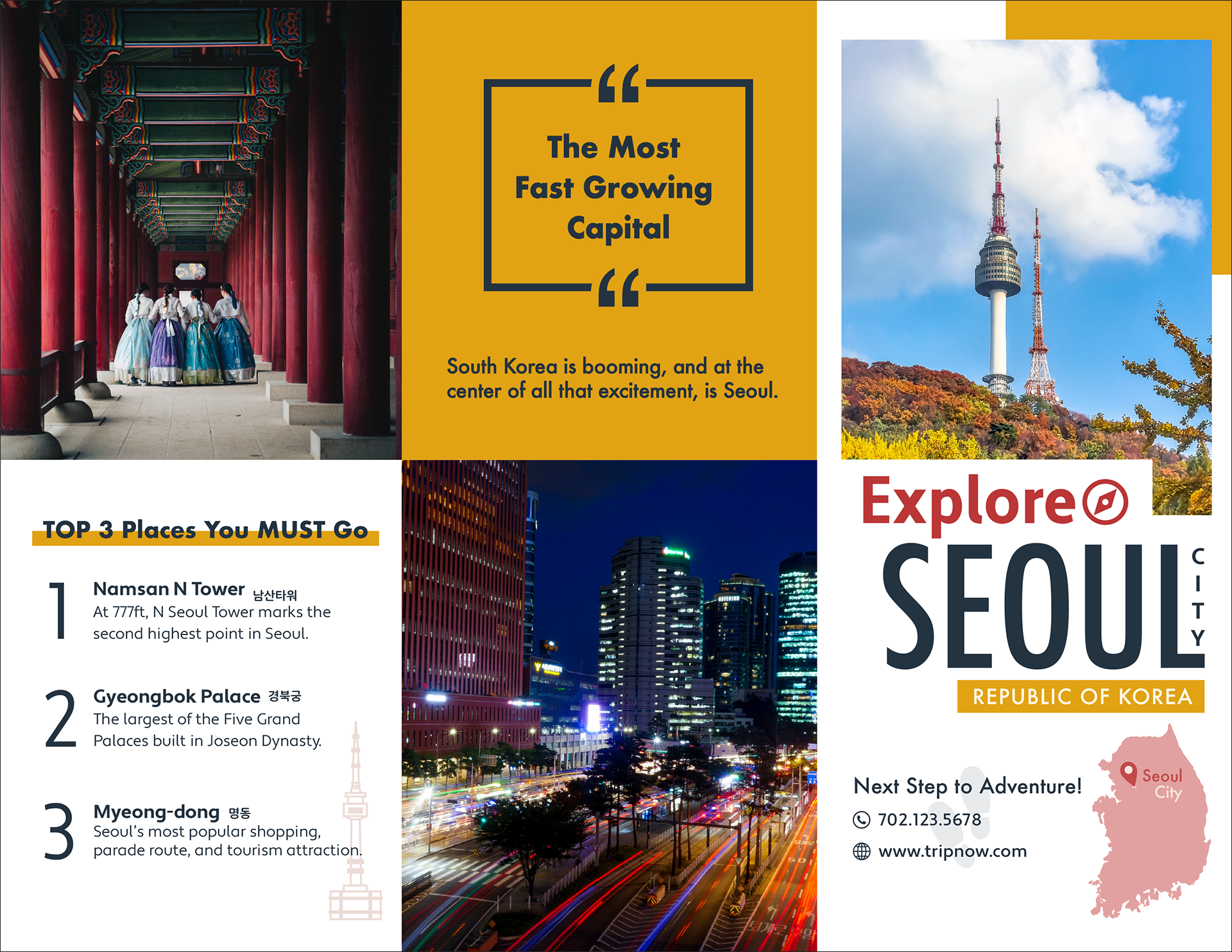 A 3-panel travel brochure was designed by the city choice of Seoul, South Korea. The task was to search for appropriate assets, create iconography, and layout content copy with effective visual communication for a hypothetical travel agency.